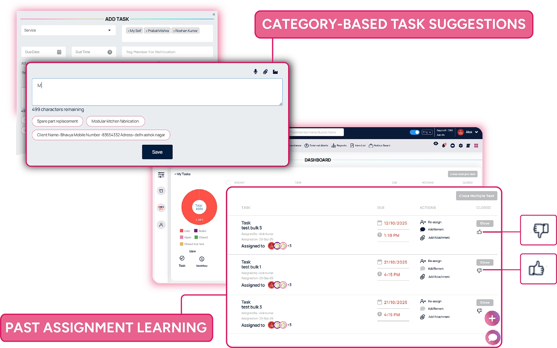- Category Based Suggestions for Tasks : When creating a task, the system analyzes the chosen category and subcategory and suggests members of the team who have already handled similar work. This helps the managers to instantly identify a person who is best suited for the work.